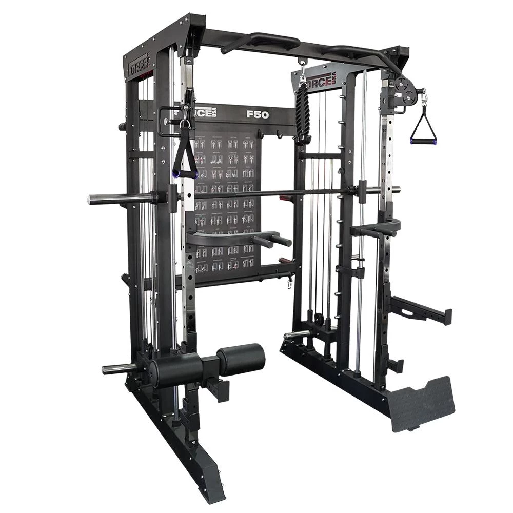 Designed for your home or commercial gym, the brand new Force USA® F50 All-In-One Trainer features a state-of-the-art Smith Machine (300kg loading), Power Rack, Lat Pulldown Bar, and Multi-Grip Chin-Up and Dip Stations. Force USA has also added new built-in cable attachments, extra barbell storage and an expanded exercise chart. Made with heavy-duty high tensile steel and commercial grade fixtures throughout, this beast of a machine will deliver a full-body workout without you having to purchase numerous pieces of equipment.