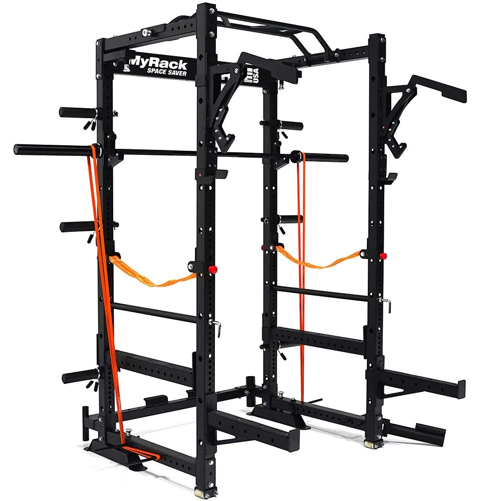 | STORAGEThe MyRack SpaceSaver comes equipped with rear barbell storage and storage hooks for your bands and accessories, so keep your home training space clean and tidy. |