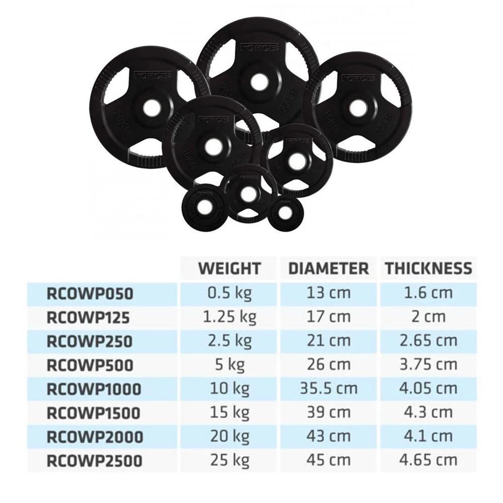 | PEACE OF MINDPerform your squats, bench press and any other free-weight exercise effectively, efficiently and safely with the Force USA® Rubber Coated Olympic Weight Plates. Available in 0.5kg, 1.25kg, 2.5kg, 5kg, 10kg, 15kg, 20kg and 25kg. We’re confident you will be happy with your purchase, so if you’re not completely satisfied we’ll give you your money back.* |