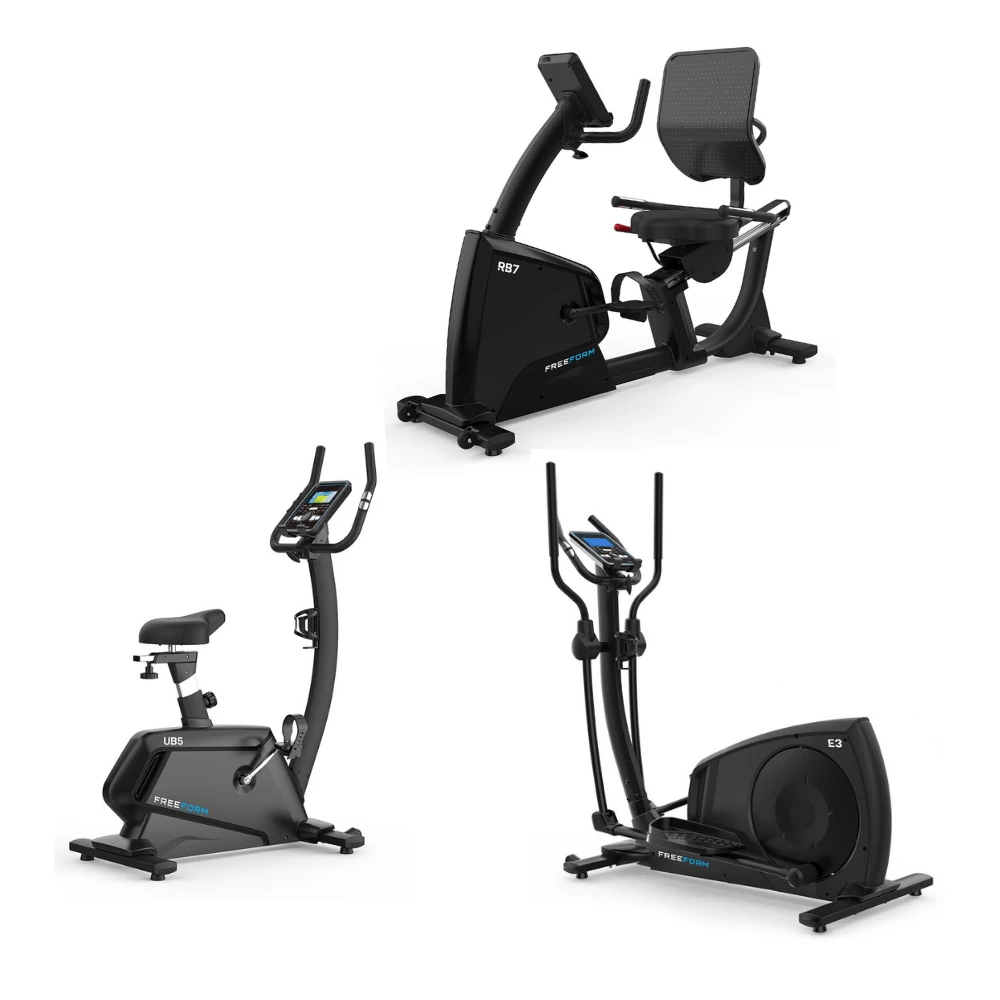 The FreeForm Home Cardio Package 2 consists of one Freeform Cardio UB5 Upright Bike, one Freeform Cardio E3 Elliptical Trainer, and one Freeform Cardio RB7 Recumbent Bike.