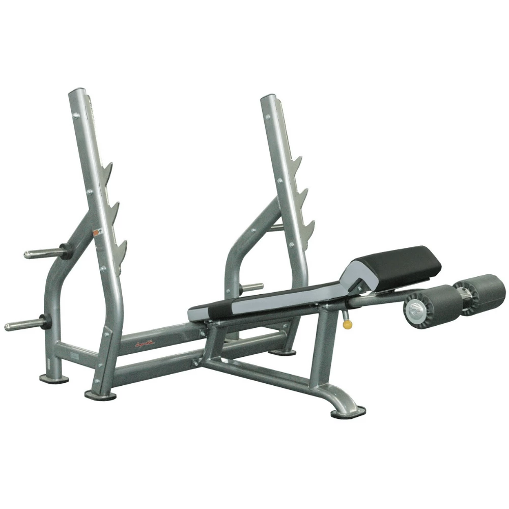 A commercial grade bench press machine with a declining back rest to cater to different angles of bench presses.