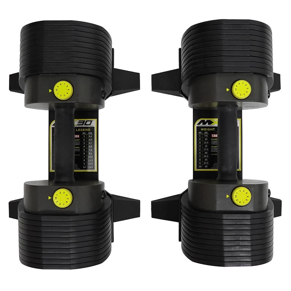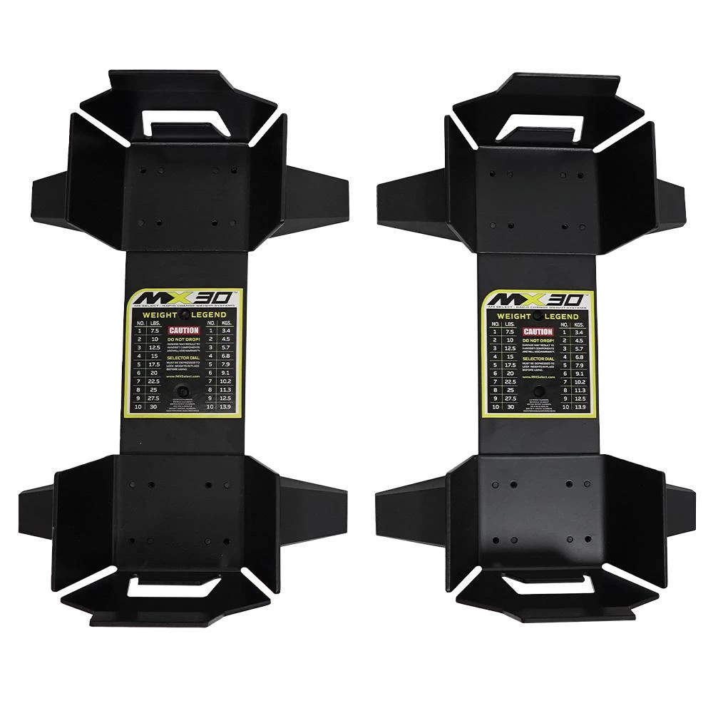 Take your weight training to a new level with the incredible performance and space-saving design of the MX30 Dumbbells. Equivalent to 10 pairs of traditional dumbbells, this heavy-duty steel set features the world-first MX Select patented rack and pinion selection system for rapid weight change. Quickly move between 4.5kg-13.9kg (7.5lbs-30lbs) and enjoy the balanced feel and contoured grip on every set. Compact, totally secure and less expensive than buying comparable free weights, the MX30 Dumbbells have your name on them.