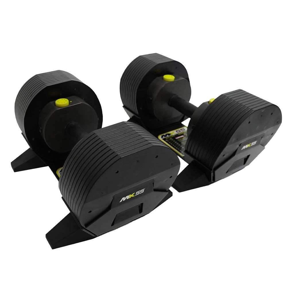 | WORLD CLASS DUMBBELL DESIGNThe MX55 Dumbbell System features the world-first MX Select patented rack and pinion selection system for rapid weight change (2.25kg increments). Once cradled, you simply choose your desired weight at the turn of a dial and it’s locked into place as soon as the selector dial is pushed home. The ergonomic design ensures every selected weight is well balanced and safe to use, which makes it the ideal choice for both stationary upper body exercises and your favourite HIIT workouts.