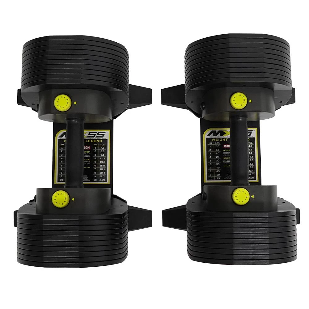 The high-performance, space-saving MX55 Dumbbells will help take your strength and fitness to a whole new level. Equivalent to 10 pairs of traditional dumbbells, this heavy-duty steel set features the incredible MX Select patented rack and pinion selection system for rapid weight change. Quickly move between 4.5kg-24.9kg (10lbs-55lbs) and enjoy the balanced feel and contoured grip on every set. Compact, totally secure and designed for all fitness levels, the MX55 Dumbbells are just what your home gym needs.