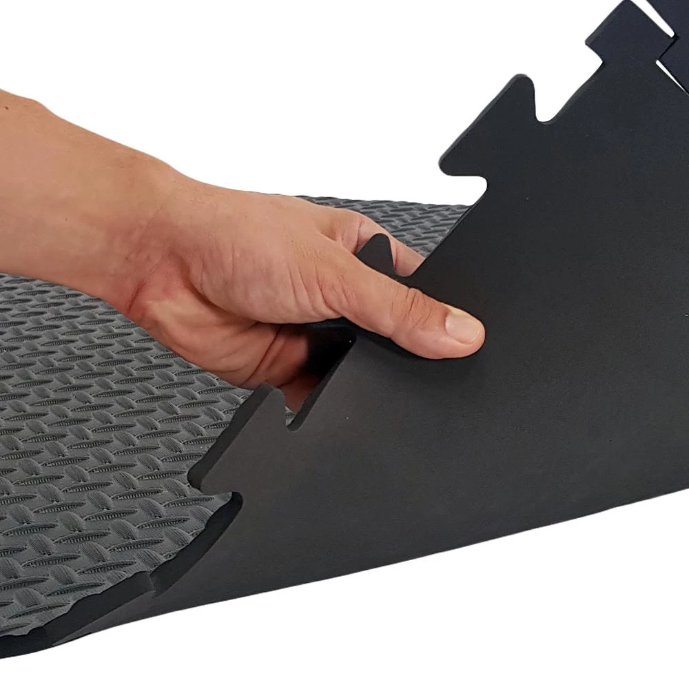 Increase the safety, grip, and overall aesthetics in your home or garage gym with the VersaFit® EVA Flooring Tiles. With an interlocking jigsaw border, the design ensures the tiles won’t move once installed. The soft yet resilient high-grade foam padding is easy to clean, anti-slip, and shock absorbent. The diamond plate textured surface on the top side assists anti-fatigue when used in workshops and garages.